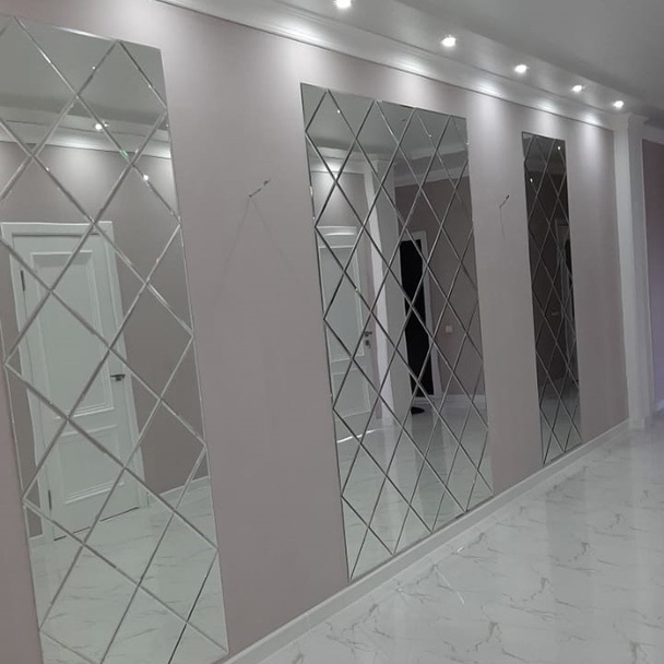 Использована квадратная серебристая зеркальная плитка размером 18х18.